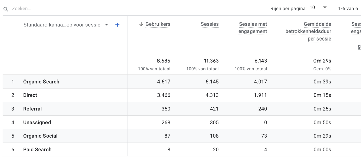 Om dit wat specifieker in te zien dan de standaard kanalen kan je in de tabel links bovenin kiezen voor "Sessiebron/-medium".