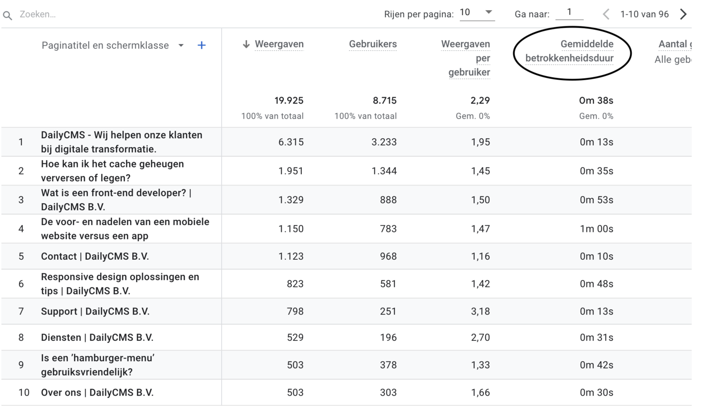 - Gemiddelde betrokkenheidsduur (per pagina)