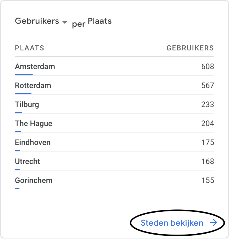 Grote kans dat je als organisatie of bedrijf richt op een bepaald gebied om diensten te verlenen of producten te verkopen. In Google Analytics kan je zien waar je gebruikers zich bevinden. Gebruikers per plaats vind ik een van de meest interessante overzichten.