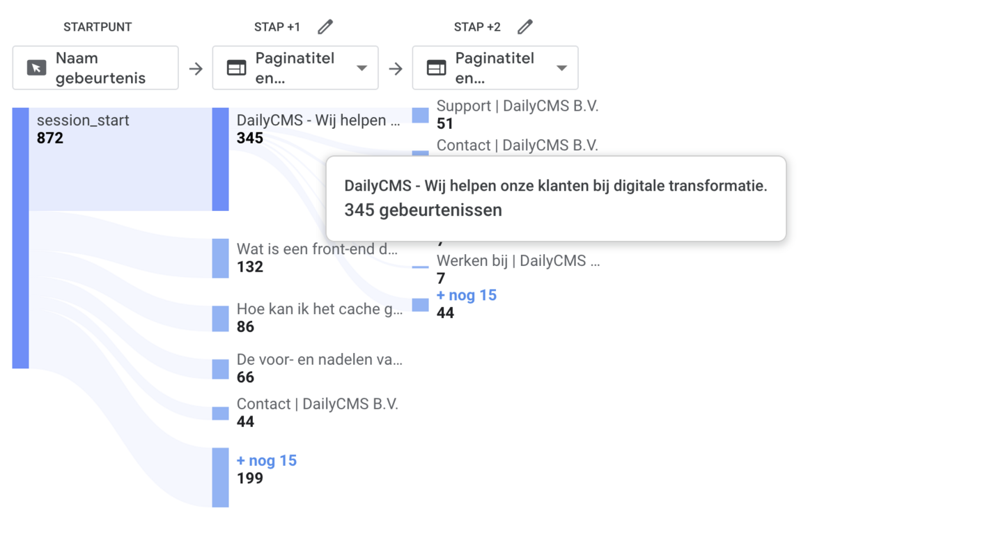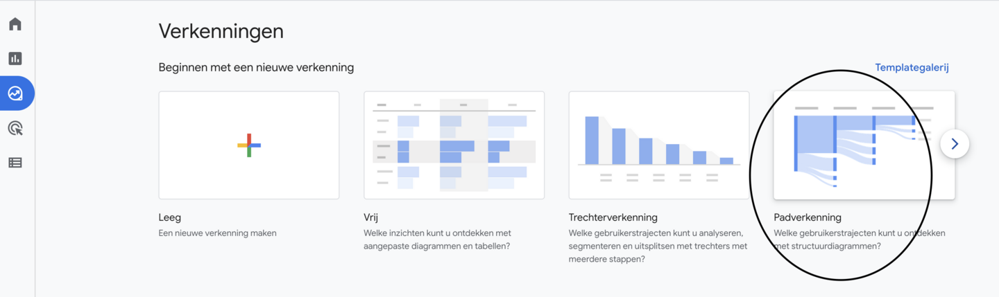 Voorheen was dit een standaard grafiek genaamd gedragsstroom. In Google Analytics 4 moet je daar een "verkenning" voor aanmaken. Dit betreft een geavanceerd functie.