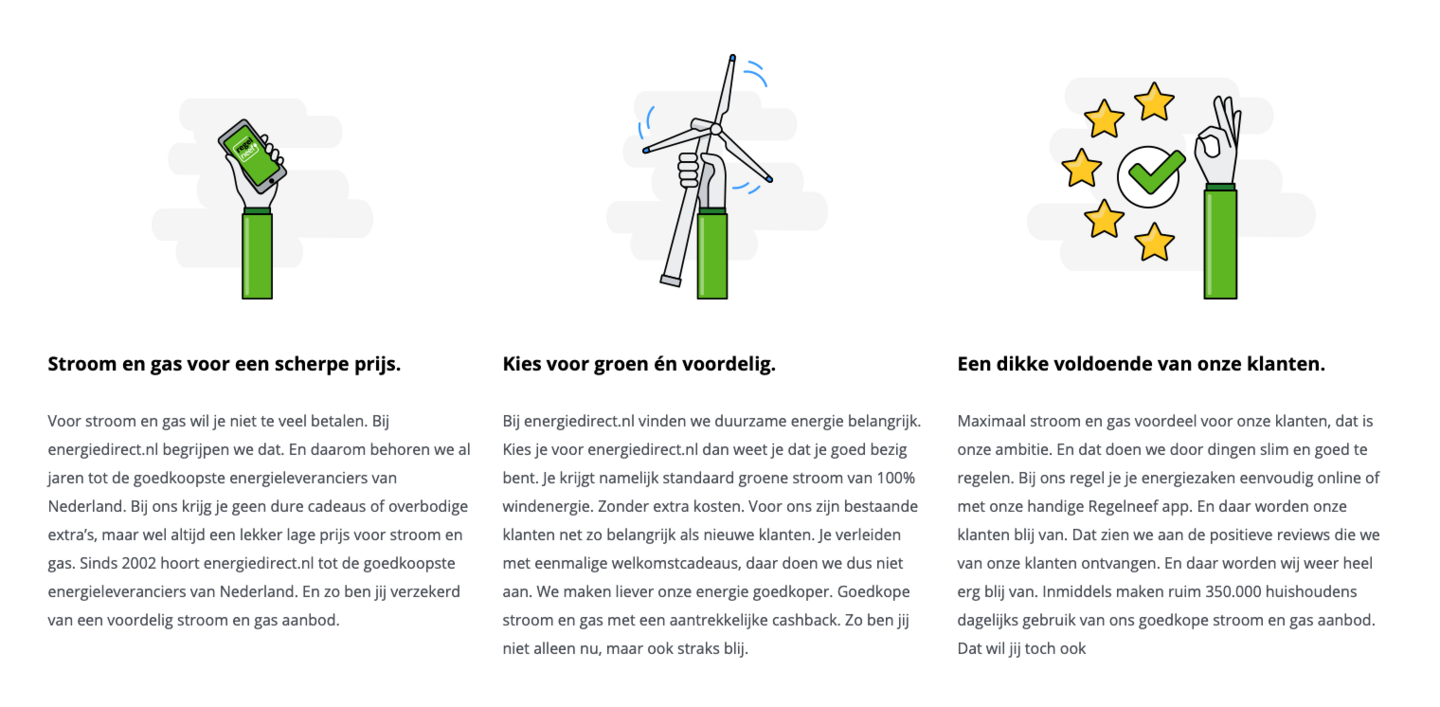 Een hoofdkop alleen is niet genoeg om bezoekers te overtuigen. Daarvoor is meer ondersteunende tekst voor nodig waarbij het de kunst is om een voordeel samen met een functie te beschrijven. Een functie heeft bijvoorbeeld een specifieke kwaliteit die een positief effect heeft op jouw product of dienst.