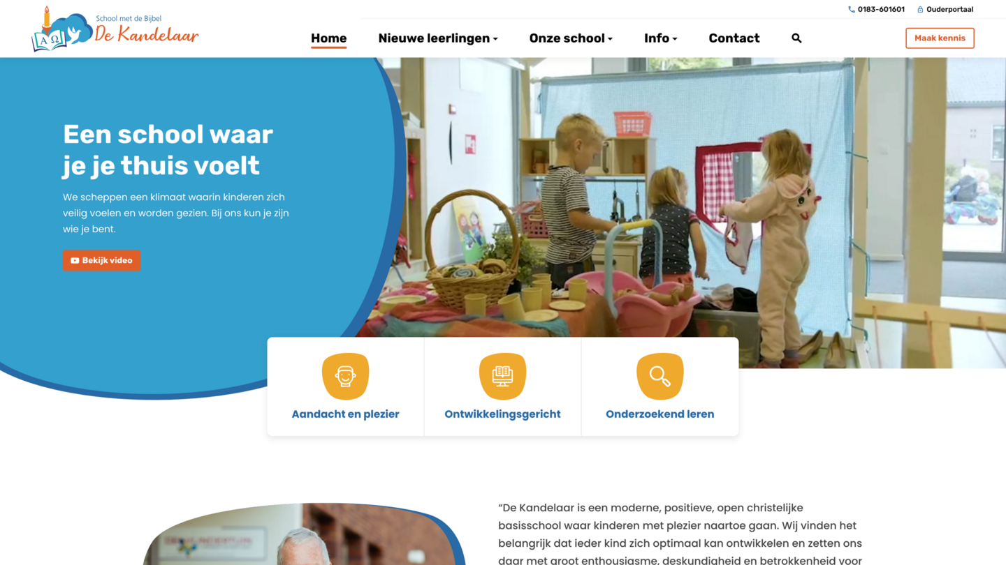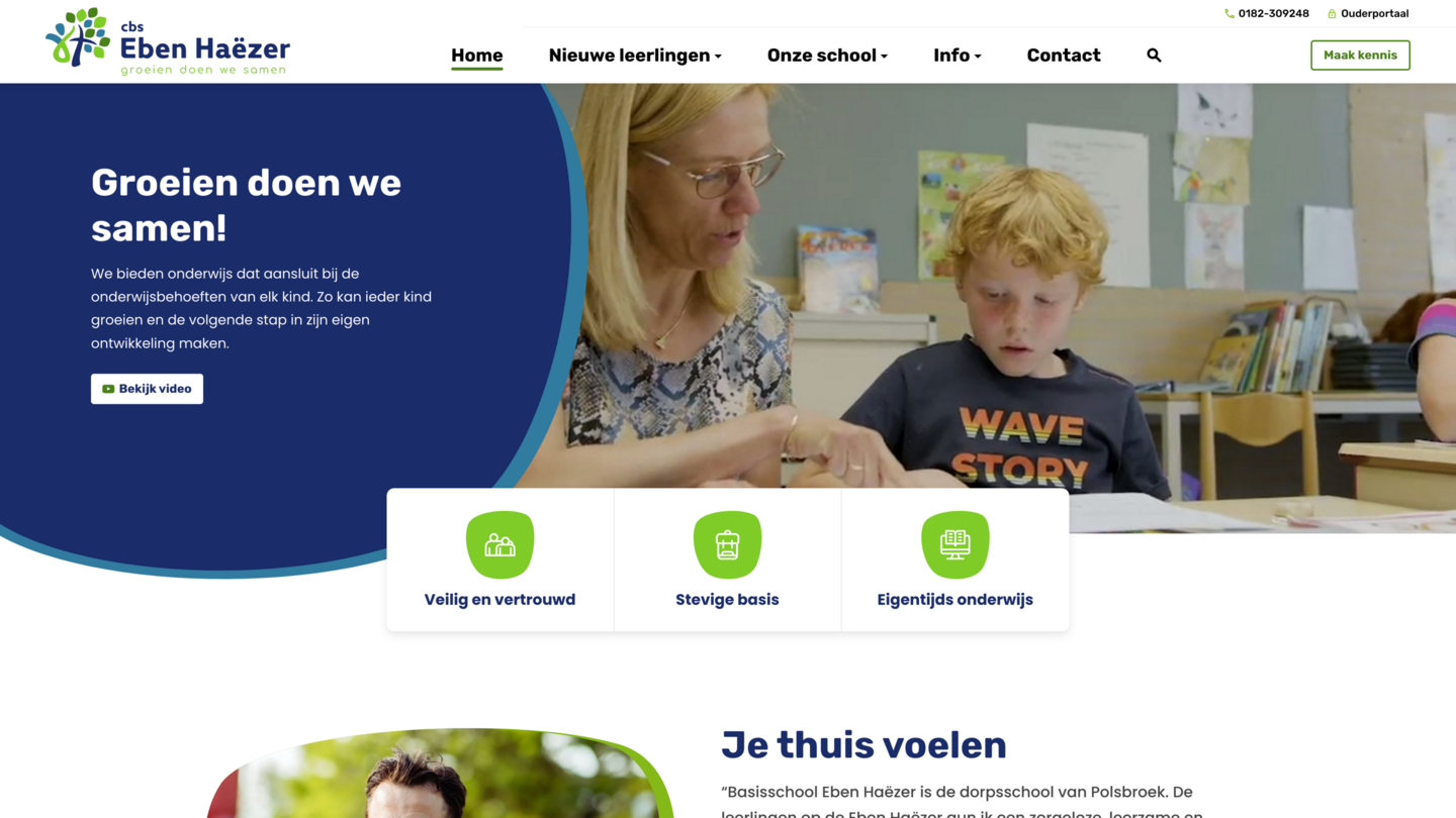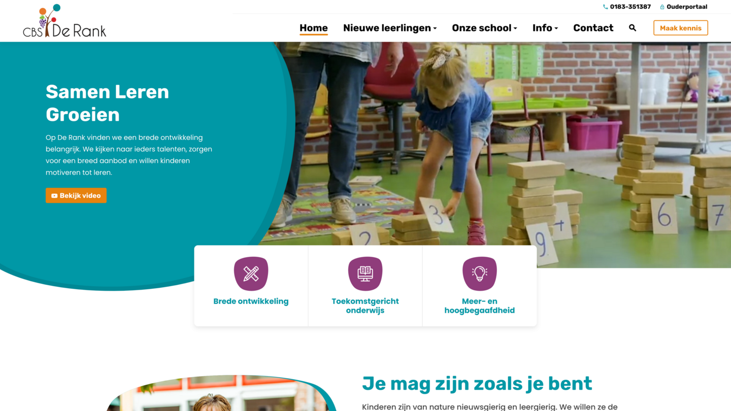 Ondanks dat we één webontwerp gebruiken voor het realiseren van 15 basisschool websites is toch iedere basisschool anders. Door het logo en de kleuren van een basisschool door te voeren op het webontwerp krijgt iedere website toch een andere uitstraling. Vanzelfsprekend zijn de schoolwebsites inhoudelijk uniek qua teksten en beeld
